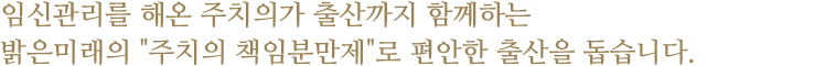 임신 정기 검사와 진료를 담당한 의사가 분만까지 책임지는 것은 병원 운영상 결코 쉬운 일이 아닙니다. 밝은미래 산부인과는 가능한 한 임신 전 과정을 함께한 주치의가 출산의 순간까지 동행하는 것을 원칙으로 합니다. (단, 심야나 응급상황 등 주치의의 참여가 물리적으로 어려운경우에는 당직 산부인과 전문의가 분만을 집도할 수 있음)
